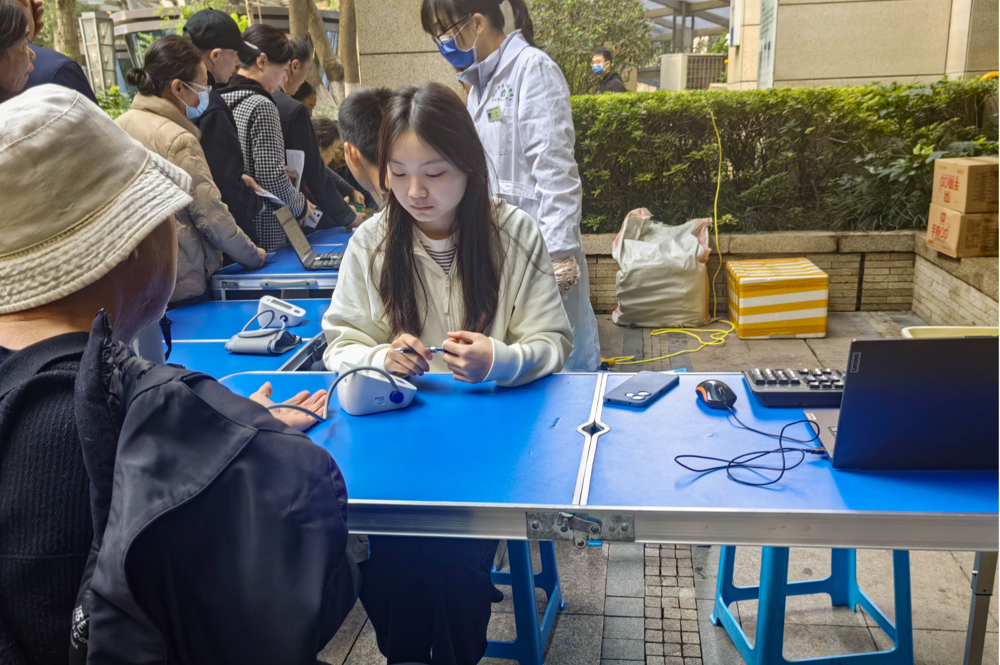 志愿活动现场,志愿者们化身医务人员的“得力助手”,化身老人家的“贴心向导”。志愿者们分工明确,配合默契。耐心引导老人排队,维护现场秩序,确保体检流程高效顺畅,对于等候中的老人,志愿者们主动上前沟通,提前告知检查项目;协助医务人员为老人测量血压,并一丝不苟地记录下每一个数据,与此同时,在医护人员的指导下,志愿者们体验亲身为老人量血压的过程;志愿者们俯身轻声与老人交流,帮助他们填写基本信息表格,解答流程上的疑问。一抹抹青春的“志愿红”与白衣天使的身影交织,构成了社区里最温暖的风景线。