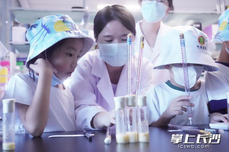 “150天!”“7天!”不远处的争论吸引了记者的注意,原来是“果蝇早期胚胎观察”组的老师正在问小朋友们果蝇长大所需的时间,大家意见不一,争得热火朝天,直到陈雨薇老师向小朋友们解释是15天,才平息了这场争论。她以人类长大和果蝇长大做类比,向大家介绍了“为什么果蝇是实验室的小明星”。中南大学湘雅医院精准分子医学研究所研究员袁凯向记者介绍设计这个实验的初衷:“读书不光是背东西,孩子们在实验室里接触到研究生所用的设备,自己动手效果会更好,也可以真正培养孩子们在这方面的兴趣。”